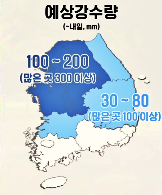 서쪽에서 다가온 강한 비구름대의 영향으로 비가 많이 내리고 있습니다. 이번 장마는 앞으로 10일 이상 오랫동안 계속될 것으로 보입니다. 오늘까지 예상되는 비의 양은 강원 영동을 제외한 중부지방에 100~200mm 많게는 300mm 이상 내릴 것으로 예상이 됩니다.